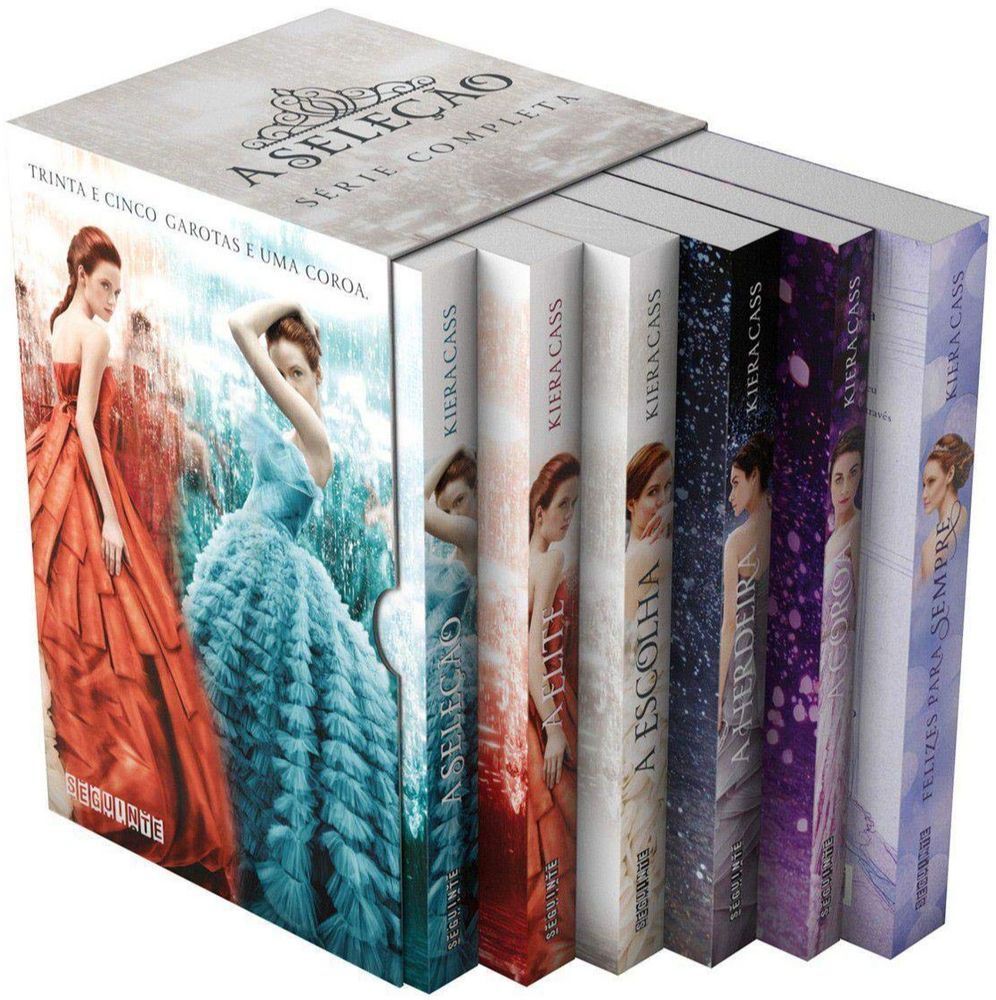 Muitas garotas sonham em ser princesas, mas este não é o caso de America Singer. Tudo o que ela queria era ter um pouquinho mais de dinheiro, para poder revelar seu namoro secreto com Aspen, que pertence a uma casta mais baixa. Ela topa se inscrever na Seleção só para agradar a mãe, certa de que não será sorteada para participar da competição em que o príncipe Maxon escolherá sua futura esposa. Mas é claro que seu nome aparece entre o das Selecionadas...No palácio, em meio a vestidos deslumbrantes e banquetes deliciosos, America precisa aprender a lidar com a ameaça constante dos ataques rebeldes e a disputa acirrada com as outras competidoras, já que Maxon parece especialmente encantado por ela. Com o coração dividido, America começa a refletir sobre tudo o que tinha planejado para si mesma - e percebe que a vida com que sempre sonhou talvez não seja nada comparada ao futuro que ela nunca tinha ousado imaginar.A história continua em Felizes para sempre, um livro extra ilustrado que traz quatro contos pelo ponto de vista de outros personagens da série, e em A herdeira e A coroa, que narram a história da filha de America.O box contém os livros A Seleção, A Elite, A Escolha, A Herdeira, A Coroa e Felizes para sempre.