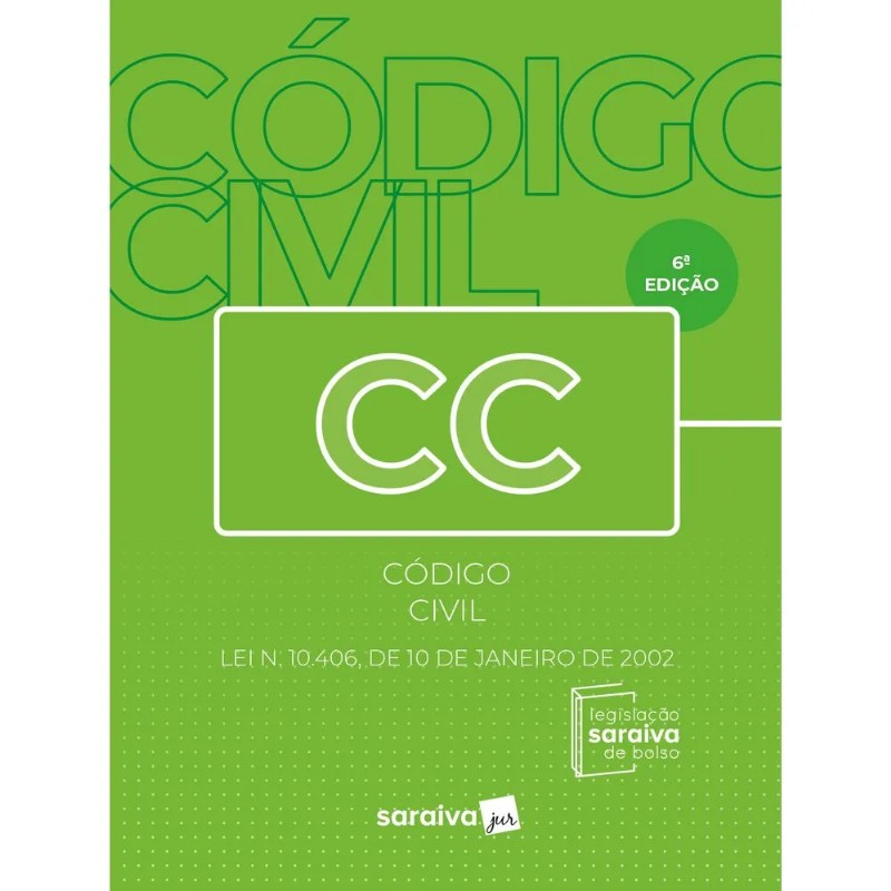 Data de fechamento da obra: 26-12-2023.AEditora Saraiva Jur, líder no mercado de livros jurídicos e sempre atenta àsnecessidades dos profissionais e interessados neste meio, apresenta a edição daobra Código Civil Legislação Saraivade Bolso. Estaobra é composta pela Lei n. 10.406, de 10 de janeiro de 2002, sem notaseditoriais, para rápida consulta no dia a dia. ÚltimasAtualizações no texto do Código Civil:Guardacompartilhada (Lei n. 14.713, de 30-10-2023) Contrato deadministração fiduciária de garantias (Lei n. 14.711, de 30-10-2023) Contrato decomissão (Lei n. 14.690, de 3-10-2023) Herdeiro oulegatário indigno excluídos da sucessão (Lei n. 14.661, de 23-8-2023) Imissãoprovisória na posse Direitos Reais e Hipoteca (Lei n. 14.620, de 13-7-2023) Fundo deInvestimento (Lei n. 14.754, de 12-12-2023)