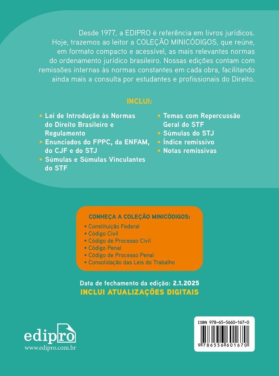 Desde 1977, a EDIPRO é referência em livros jurídicos. Hoje, trazemos ao leitor a COLEÇÃO MINICÓDIGOS, que reúne, em formato compacto e acessível, as mais relevantes normas do ordenamento jurídico brasileiro. Nossas edições contam com remissões internas às normas constantes em cada obra, facilitando ainda mais a consulta por estudantes e profissionais do Direito. INCLUI: Lei de Introdução às Normas do Direito Brasileiro e Regulamento Enunciados do FPPC, da ENFAM, do CJF e do STJ Súmulas e Súmulas Vinculantes do STF Temas com Repercussão Geral do STF Súmulas do STJ Índice remissivo Notas remissivas CONHEÇA A COLEÇÃO MINICÓDIGOS: Constituição Federal Código Civil Código de Processo Civil Código Penal Código de Processo Penal Consolidação das Leis do Trabalho