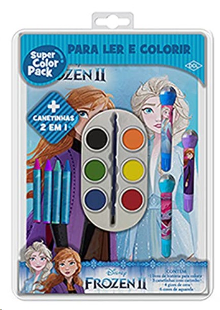 Um superkit repleto de atividades com as princesas Elsa e Anna, de Frozen. O blíster inclui livro para ler e colorir, gizes de cera, paleta de aquarela e canetinhas com carimbos acoplados.