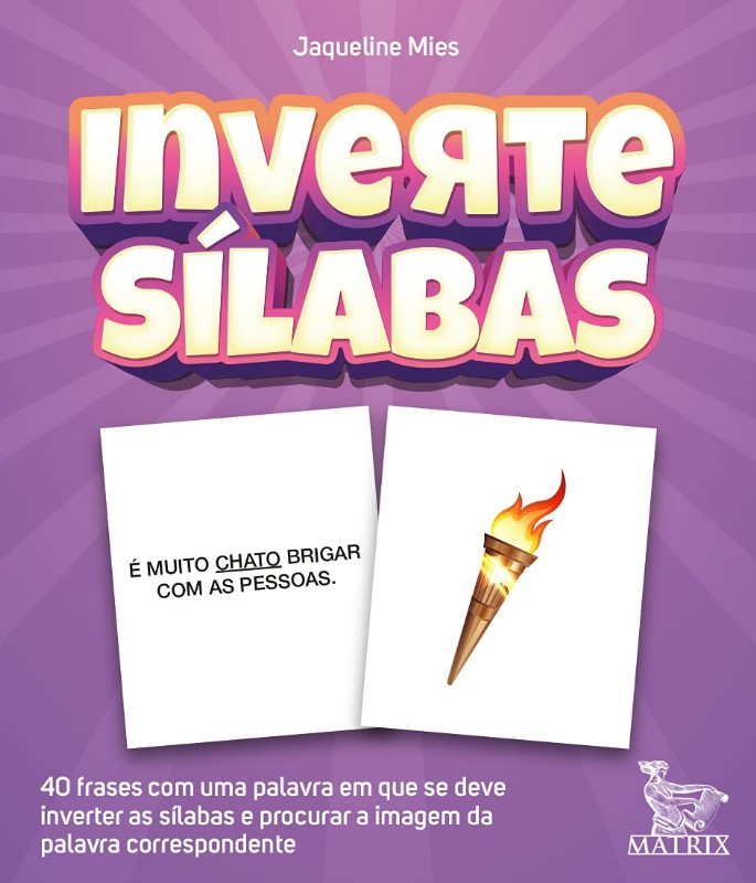 Cabo vira boca, lama vira mala e assim por diante. A criançada vai se divertir, ao mesmo tempo trabalhar memória, atenção, concentração, transposição silábica, percepção visual e muito mais. Inverte sílabas é um livro-caixinha composto por 40 cartas, das quais 20 trazem uma frase com uma palavra grifada. A criança vê essa palavra, inverte as sílabas e vai procurar entre as outras 20 cartas aquela que tem a imagem que corresponda à palavra formada pela inversão. Uma obra que criança nenhuma vai querer trocar por outra.