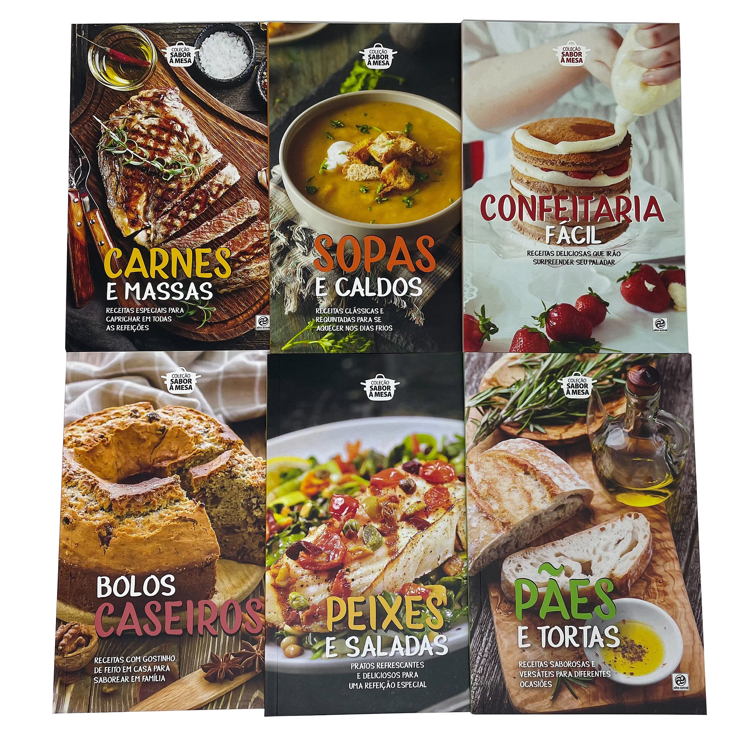 Kit com 6 livros da coleção Sabor à mesa, coleção de receitas e ingredientes para diversos tipos de comidas e sobremesas, de massas à churrasco. Com as receitas que apresentamos você poderá desfrutar de uma refeição digna de restaurante no conforto do seu lar.