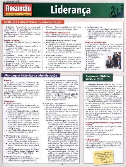 Este guia prático traz as principais definições sobre a administração e os papéis do administrador. Cultura organizacional, administrando a diversidade e equipes multiculturais, tomada de decisão, princípios fundamentais do planejamento, gestão estratégica, administração dos recursos humanos, delegação, responsabilidade e autoridade, motivação e inovação são alguns dos temas abordados.RESUMAO ADMINISTRACAO E NEGOCIOS - LIDERANCARESUMAO ADMINISTRACAO E NEGOCIOS - LIDERANCA