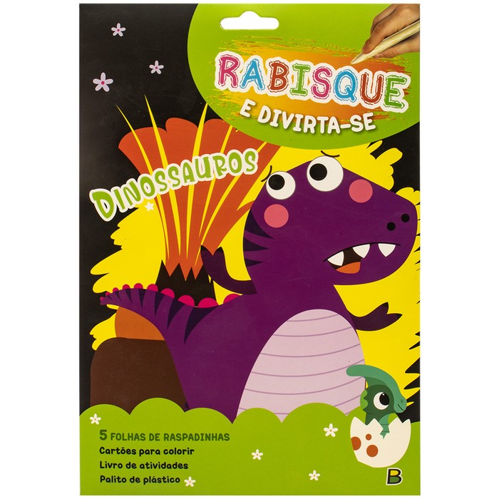 Venha conhecer os Dinossauros. Comece resolvendo as atividades do livreto. Em seguida, raspe a camada preta com palito e descubra uma ilustração colorida. Por fim, pinte o desenho do outro lado.
