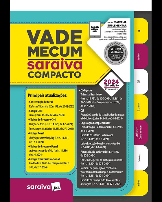 Com conteúdo criteriosamente selecionado para consulta básica no dia a dia, o Vade Mecum Compacto chega à sua 29 edição.A obra reúne as normas mais utilizadas por profissionais e acadêmicos da área jurídica.Sua estrutura foi pensada de forma a proporcionar o maior número de diplomas legislativos sem comprometer a legibilidade e o trabalho editorial.A edição traz ainda notas de correlação entre as matérias, já tão tradicionais nas obras de legislação Saraiva, assim como índices multifuncionais, que permitem rápida localização de qualquer assunto por ordem alfabética, cronológica, pelo número do diploma ou por seu tema. Além de tudo isso, você terá acesso ao conteúdo adicional online da obra no ambiente de aprendizagem, onde encontrará:Legislação adicional diplomas que completam o extenso conteúdo impresso da obra, para você consultar em qualquer lugar;Serviço Atualize seu Código atualização semanal online de todo o conteúdo impresso. (...)